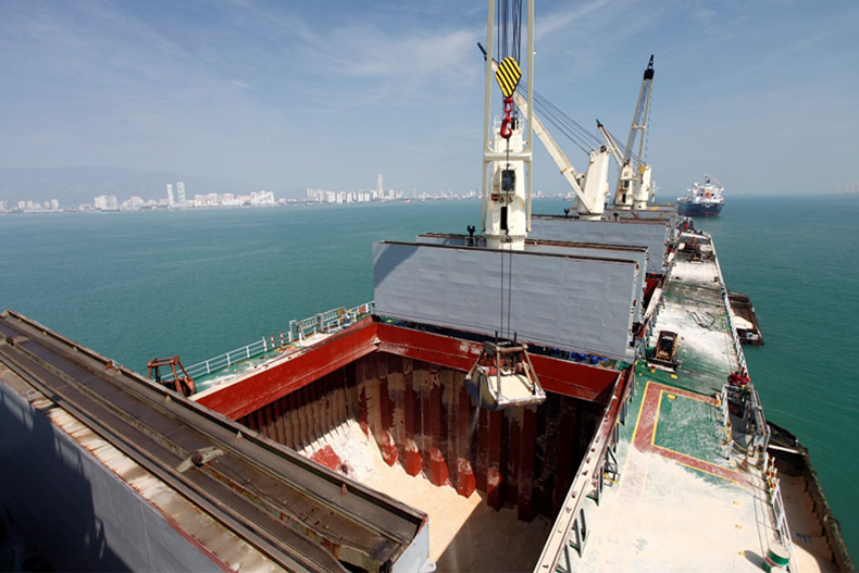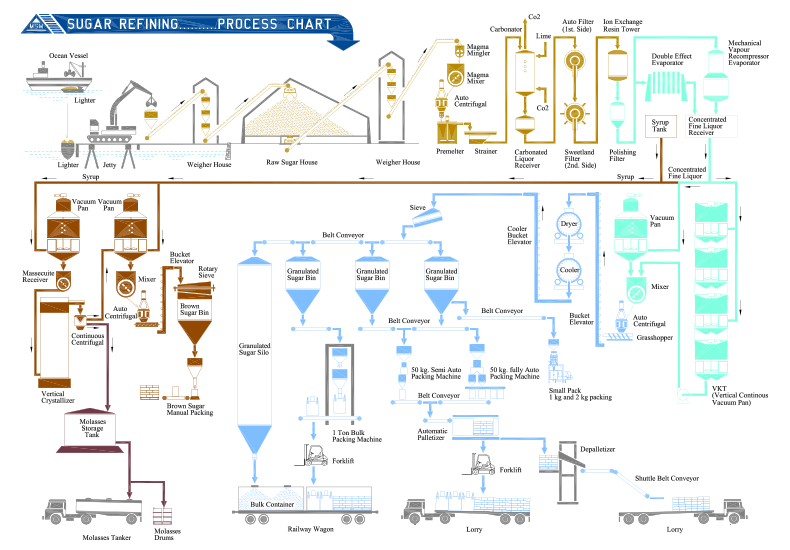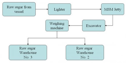 Raw sugar delivered by ocean vessels is transferred to lighters and brought to MSM jetty. A crane and excavator equipped with grab buckets are used to unload raw sugar from the lighters onto belt conveyors. The conveyors transport the sugar to a weigher for weighing before unloading the sugar in the warehouse for storage.